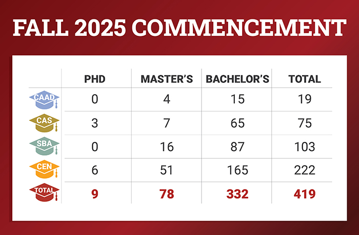 The Fall 2025 Commencement speech, titled "Shaped by Challenges", will be delivered by Alia Ahlii, who is graduating with a degree in international studies from the College of Arts and Sciences.