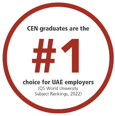 CEN receives high recognition in QS World University Subject Rankings, with civil engineering ranking #101-150 in the world and #1 in the UAE, and AUS scoring the highest in employer reputation across all engineering subjects.