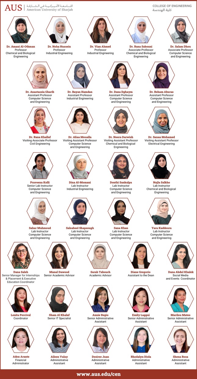 • Leading the AUS Engineering Shadow Program (ESP). October 12, 2022, marked the launch of the AUS Engineering Shadow Program (ESP), led by Dr. Rana Sabouni, Associate Professor of Chemical Engineering, and supported by Women in Engineering (WiE). The AUS Engineering Shadow Program (ESP) provides the opportunity for high school students in grades 11 and 12 to experience a day in the life of an AUS engineering student. This program is one of the first programs in the country to involve high school students in university activities. Shadows are paired with a current College of Engineering (CEN) student and attend their classes and meet professors and students. In addition, shadowing experience will also give the high school students a taste of the AUS university student’s life, from visiting our sports facilities to sampling campus cuisine in the Student Center. Moreover, shadows and their parents are invited to attend a celebration and award ceremony at the end of the program. During the ceremony, each participant will receive a certificate of participation and have the chance to meet with the CEN Engineering Faculty, Department Heads and Dean. To learn more about the program, click here or contact us at [email protected].