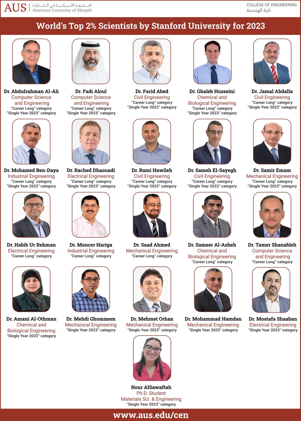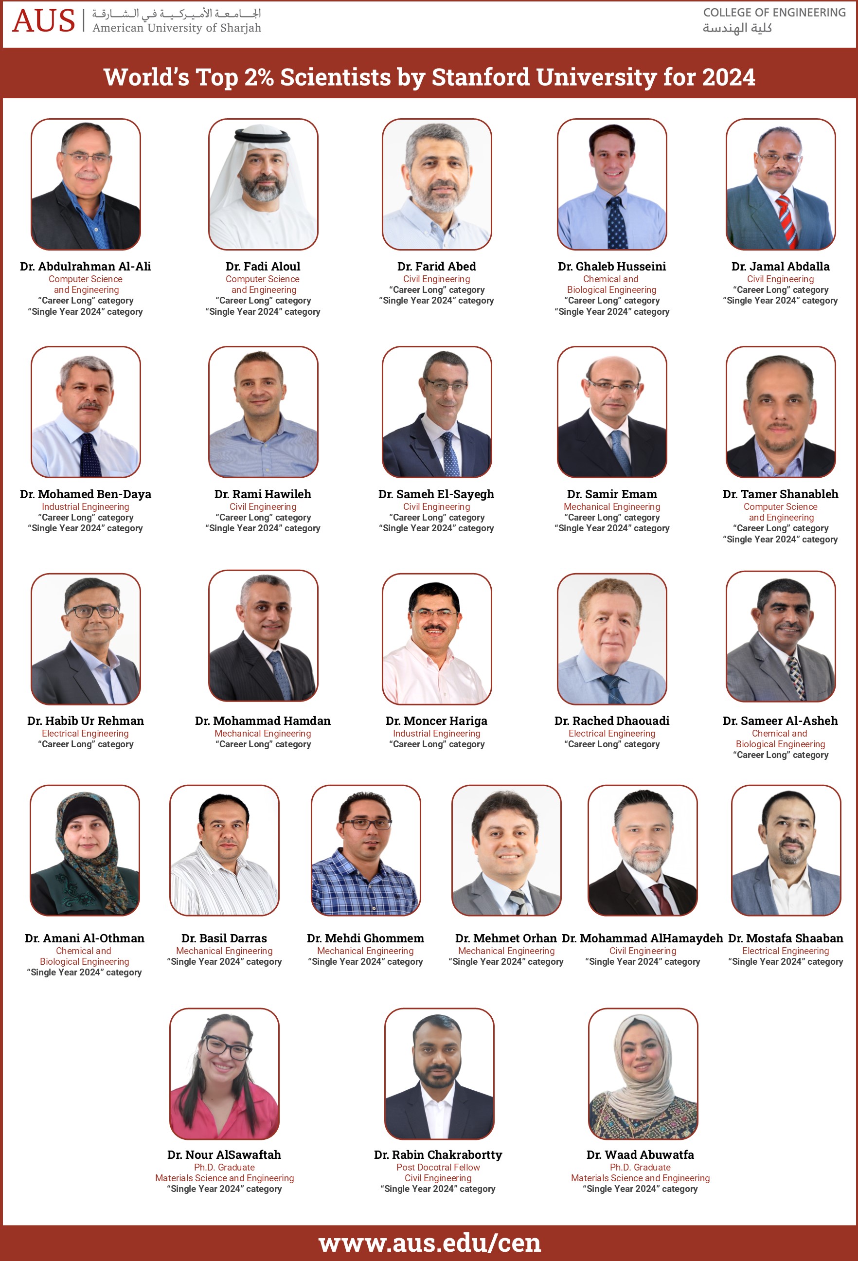 The College of Engineering at AUS is incredibly proud to have 89 outstanding full-time faculty, with 84 percent having earned their PhDs from leading universities in the US and Canada, 10 percent from leading universities in the UK, and 4 percent from leading universities in EU. The college also has 25 excellent lab instructors who hold at least a master's degree and are highly experienced.