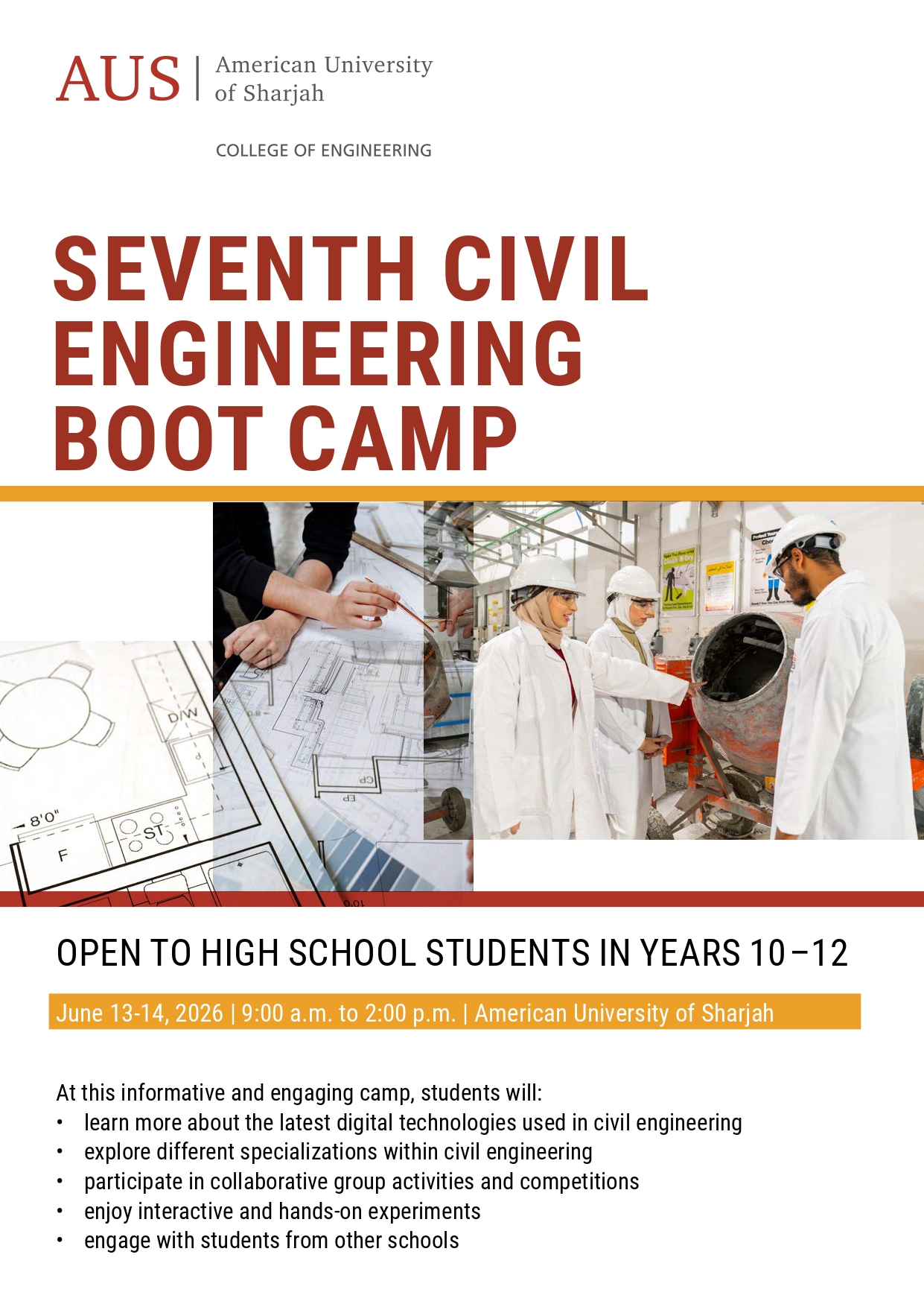 The College of Engineering (CEN) provides many opportunities for high school students to engage and learn about the various engineering disciplines that AUS offers. Explore our list of upcoming workshops and boot camps.
