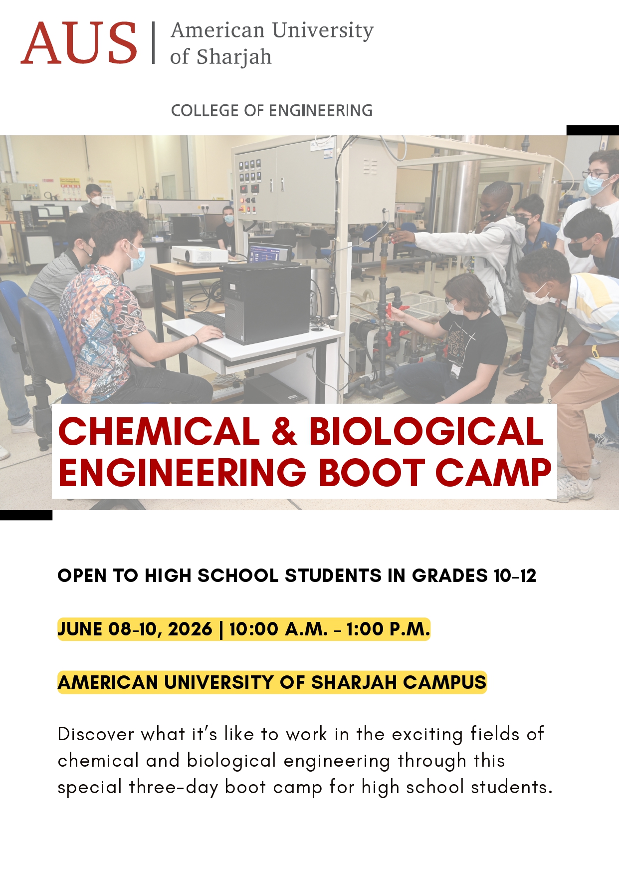 The 9th CHBE Boot Camp at the American University of Sharjah (AUS) is open to all high school students (Grade 10 – 12) in the UAE. At this informative and engaging camp, you will: