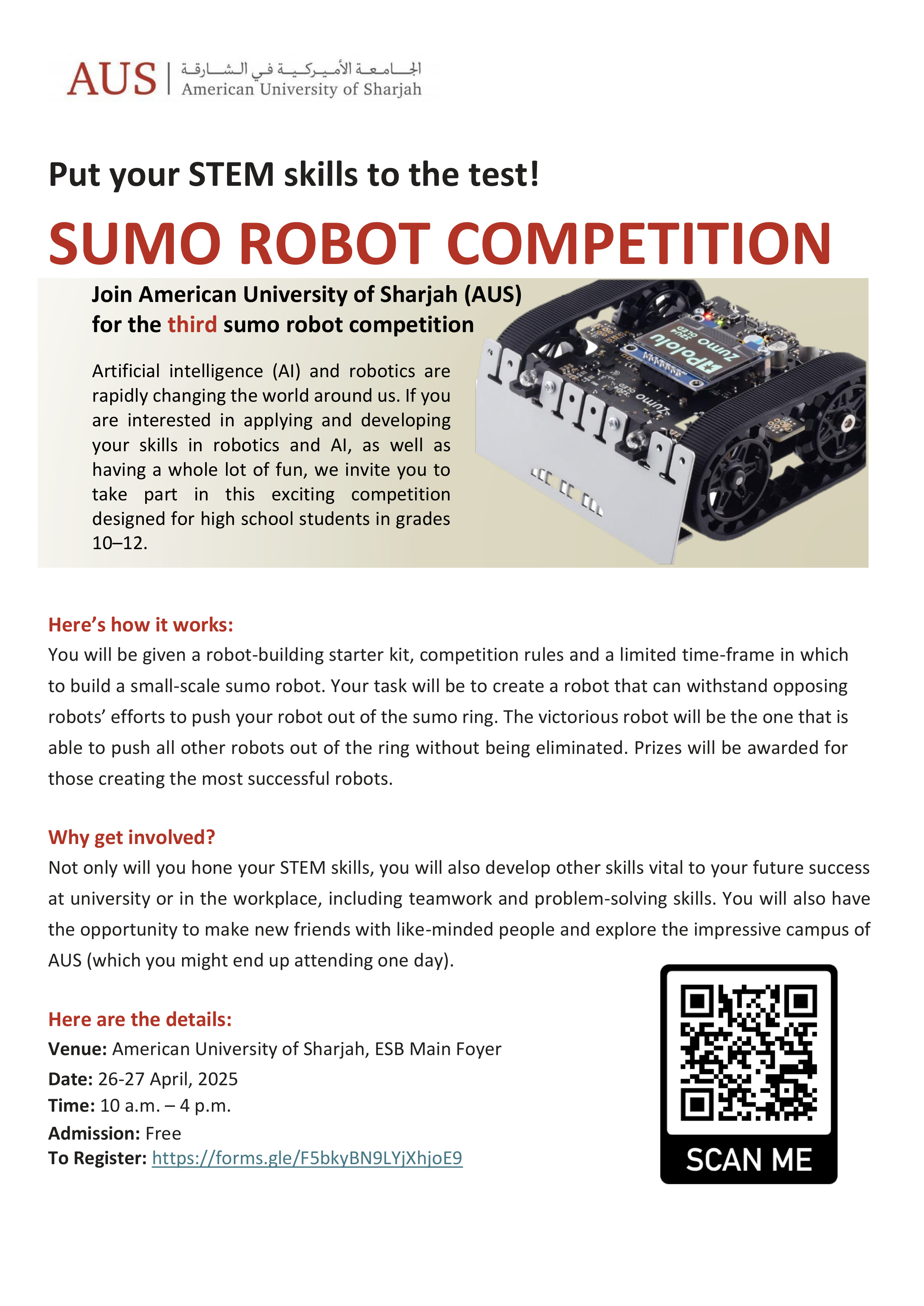 The Department of Computer Science and Engineering at the American University of Sharjah invites school students from grades 10 to 12 to participate in the 2025 AUS School Computing Competition (ASCC-2025). The aim of the competition is to promote computer science & engineering and pave the way for school students to excel in advanced sciences and technology. ASCC-2025 is sponsored by the AUS Sharakah Program.