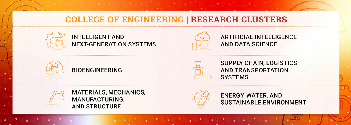 We invite you to explore these research clusters and learn more about the transformative work being conducted by our faculty members and students. Join us on this exciting journey as we continue to push the frontiers of engineering research, innovation and education.