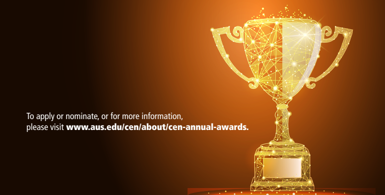 AUS CEN full-time students during the Fall 2021 or Spring 2022 semesters and alumni are encouraged to submit their applications by April 11, 2022. Students and alumni can apply to one or more of the CEN Annual Awards for the year 2022.