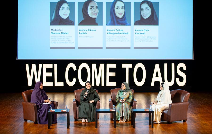 A key highlight of the event was a panel discussion moderated by Shamma Al Jallaf, AUS student and Internal Coordinator in the AUS Emirati Cultural Club. The discussion featured distinguished Emirati alumnae, including AlZaina Lootah, Fatima AlMugarrab AlMheiri and Nour Kashwani, who shared their insights on leadership, innovation and the evolving role of Emirati women in various fields.