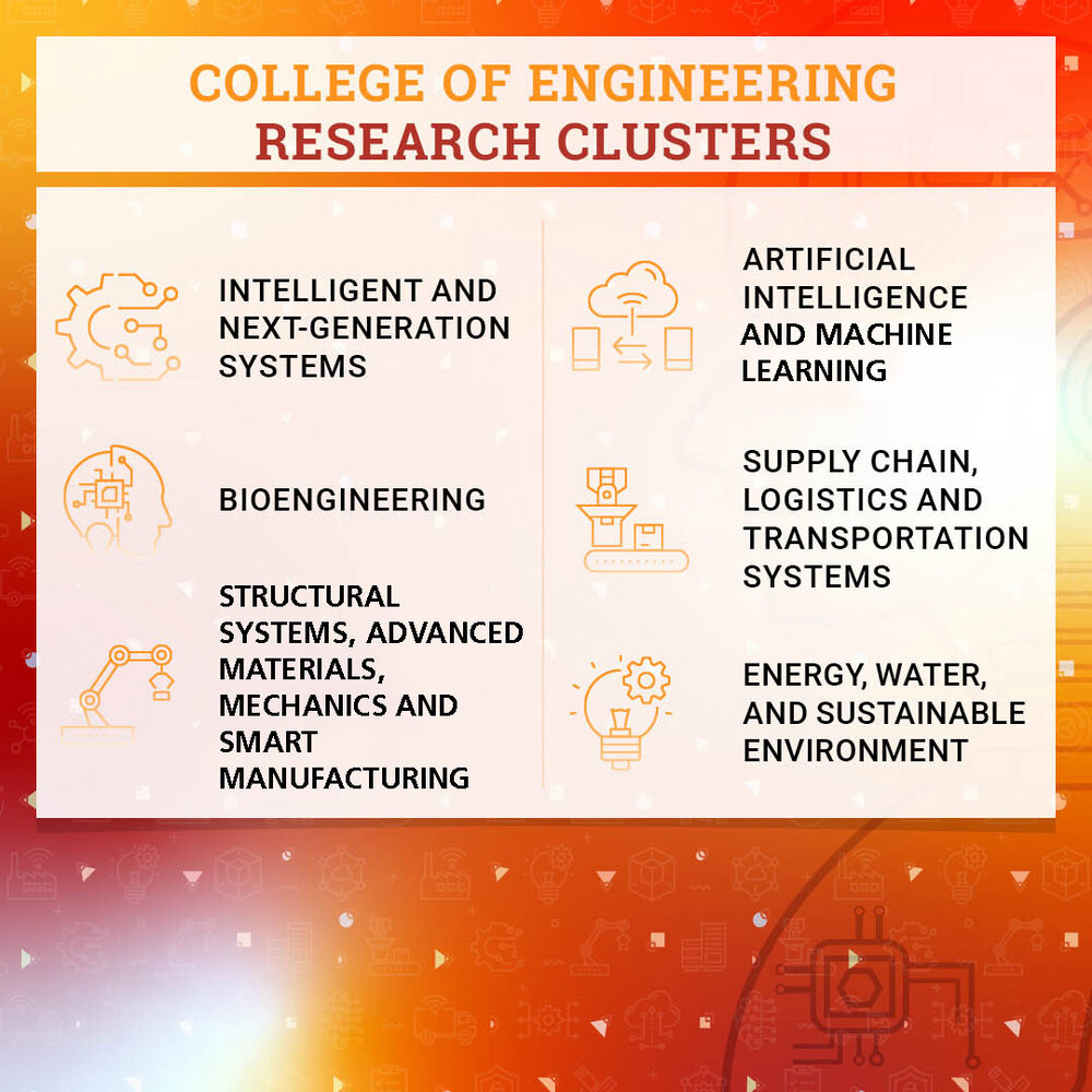 We invite you to explore these research clusters and learn more about the transformative work being conducted by our faculty members and students. Join us on this exciting journey as we continue to push the frontiers of engineering research, innovation and education.