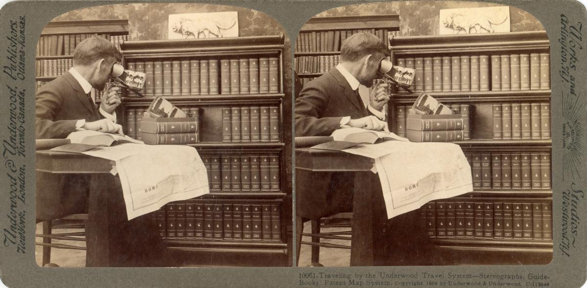 The Underwood Travel System – viewing stereoviews through a stereoscope, with map and book in hand.